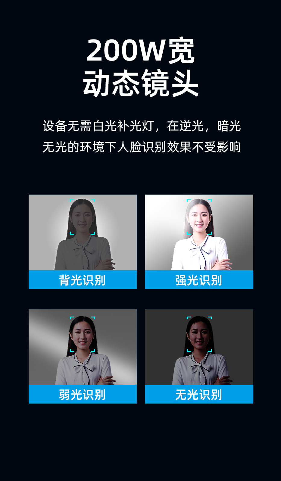 人臉識(shí)別考勤門禁一體機(jī)已在全室外強(qiáng)光,弱光,逆光環(huán)境進(jìn)行大量場(chǎng)景落地應(yīng)用,且不受年齡大小、胖瘦高矮、化妝等因素影響,對(duì)姿態(tài)、光線等適應(yīng)性強(qiáng),即使在夜間燈光下也可以輕松識(shí)別人臉;