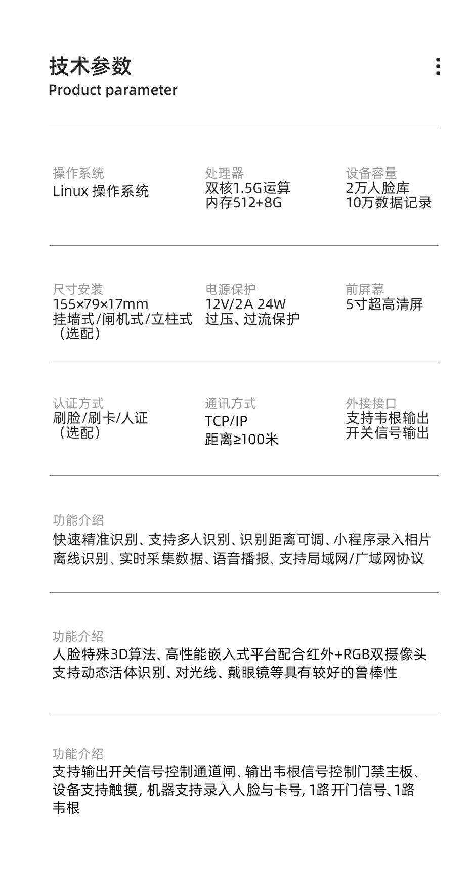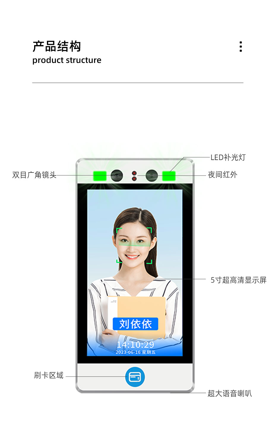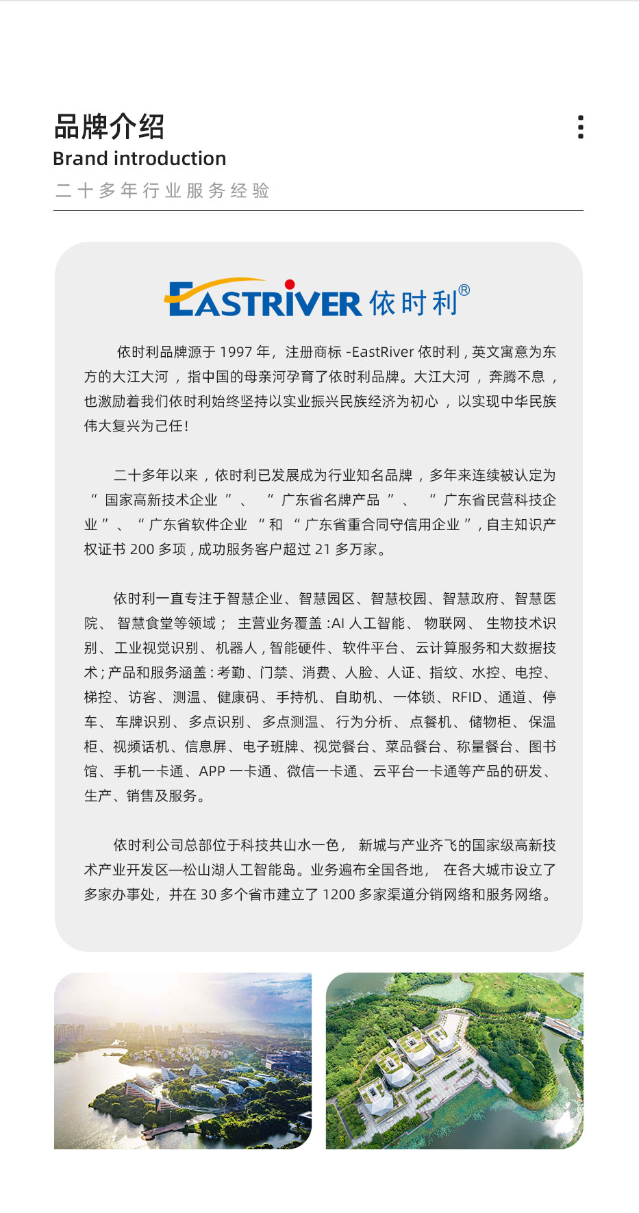 “依時(shí)利EASTRIVER”品牌AI人臉識(shí)別門禁機(jī)D5系列是我們自主研發(fā)生產(chǎn)的新一代人臉識(shí)別一體機(jī)(也稱人臉識(shí)別門禁考勤機(jī)),我們追求極致品質(zhì),采用國(guó)際一流工業(yè)設(shè)計(jì)標(biāo)準(zhǔn)。人臉識(shí)別一體機(jī)采用世界領(lǐng)先的人臉特殊3D算法,配合高速處理器,具有人臉識(shí)別速度快、識(shí)別距離遠(yuǎn)、大鏡頭,2萬人臉庫、 超大語音播報(bào)等特點(diǎn)。支持人臉識(shí)別,可以擴(kuò)展人臉測(cè)溫識(shí)別、人臉健康碼識(shí)別、人證核驗(yàn)系統(tǒng)、人臉二維碼訪客系統(tǒng)等等;我們是人臉識(shí)別一體機(jī)(一臉通)源頭生產(chǎn)廠商,可免費(fèi)提供“人臉識(shí)別”硬件API接口文檔,并協(xié)助進(jìn)行對(duì)接開發(fā)。可以支持客戶定制特殊人臉識(shí)別考勤系統(tǒng)、人臉識(shí)別門禁系統(tǒng)、人臉識(shí)別閘機(jī)等需求。人臉識(shí)別機(jī)可用于人臉門禁、校園人臉安全通道、員工考勤、會(huì)議考勤、出入口身份檢查、閘機(jī)改造等應(yīng)用場(chǎng)景, 使客戶的管理更高效、更智能、更省心。