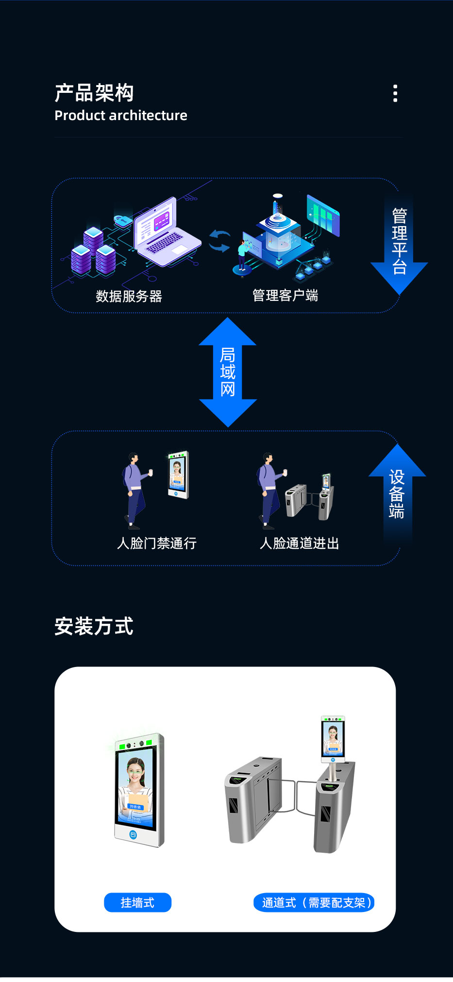 人臉識(shí)別門禁一體機(jī)可采用壁掛式平板結(jié)構(gòu)或者閘機(jī)款立柱式結(jié)構(gòu),全視角高亮屏幕,適用于園區(qū)、小區(qū)、學(xué)校、政府、醫(yī)院、企事業(yè)單位等需要考勤或者通行管理的場(chǎng)景,有效提高人員管控能力;