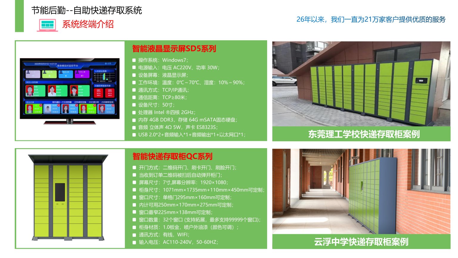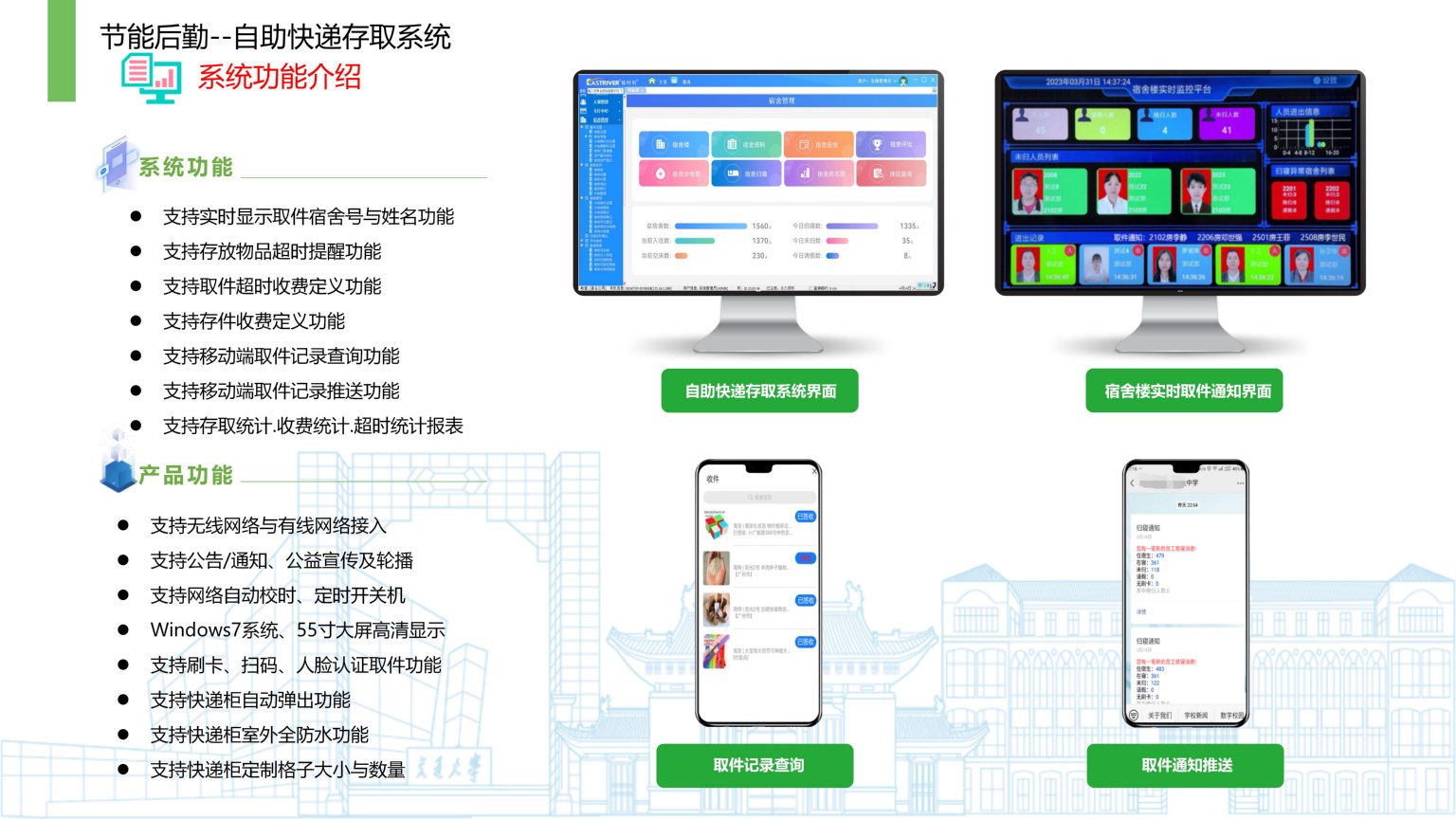 依時利校園自助快遞存取系統(tǒng)是通過統(tǒng)一管理平臺/數(shù)據(jù)庫/終端/手機端來實現(xiàn)綜合管理,為了解決家長要給孩子配送物資,快遞存放便利,方便學生自助取件。系統(tǒng)是一種利用掃碼開箱入庫、學生刷卡或刷臉取件的方式,通過信息推送與顯示通知學生取件,提高學生與家長的滿意度和便利性。